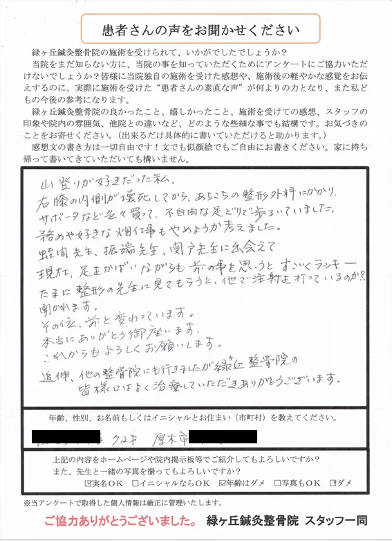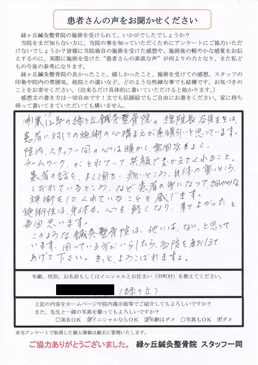 追伸、他の整骨院にも行きましたが、緑ヶ丘整骨院の皆様にはよく治療していただきありがとうございます。
