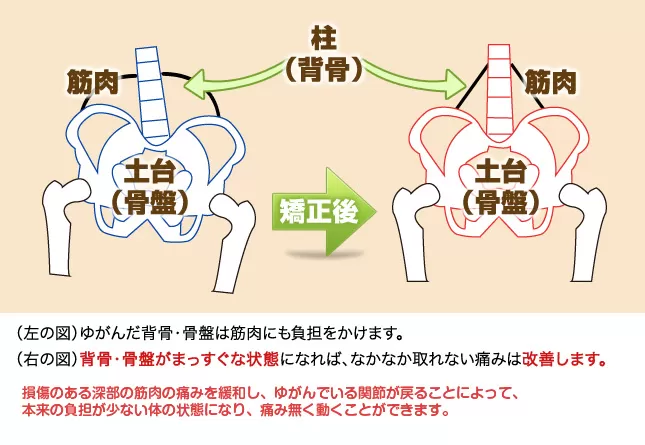つまり、いくら硬くなった筋肉をマッサージや湿布で柔らかくしたとしても、からだにゆがみが残ったままでは再び筋肉は硬くなりやすいのです。