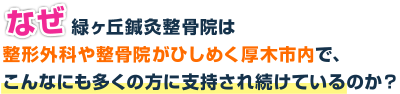 毎日多くの方が来院されていますが、特に「他でダメだった」「どこも効果を感じられなかった」」「○○の整体では、良くならなかった」と仰る方が施術を受けた方のご紹介やHPをご覧になられて、厚木の緑ヶ丘鍼灸整骨院まで足を運ばれます。