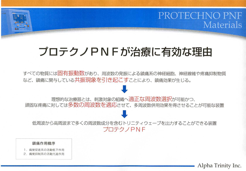 家庭用の低周波の機械には、事故が起こらないように出力にリミッターがかかっています。プ ロテクノPNFは特殊な波形を用いることによって、出力をさらに上げることが出来るようになりました。その結果、より早くより鎮痛効果が高まりました。車 に例えるならば、家庭用は軽自動車で、プロテクノPNFはF1カーです。