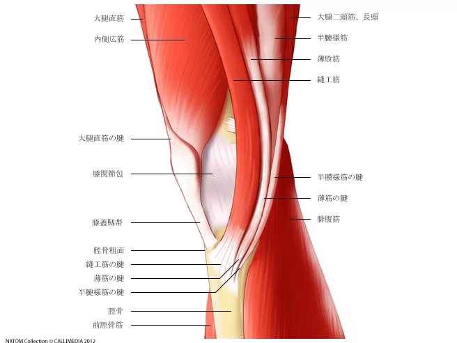 太ももの筋肉は、膝蓋骨(膝のお皿の骨)を通過して、スネの骨の上部に停止しています。